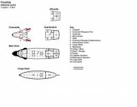 Deck and sail plans are fairly standard, as the vessel is divided into a number of watertight compartments.
