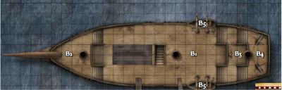 - B1. Main Deck: Two 10-foot-square hatches sit in the deck forward of the mainmast and open onto the middle hold. Between the hatches and mast, a steep set of wooden steps descends into the middle deck (area B8) 15 feet below.